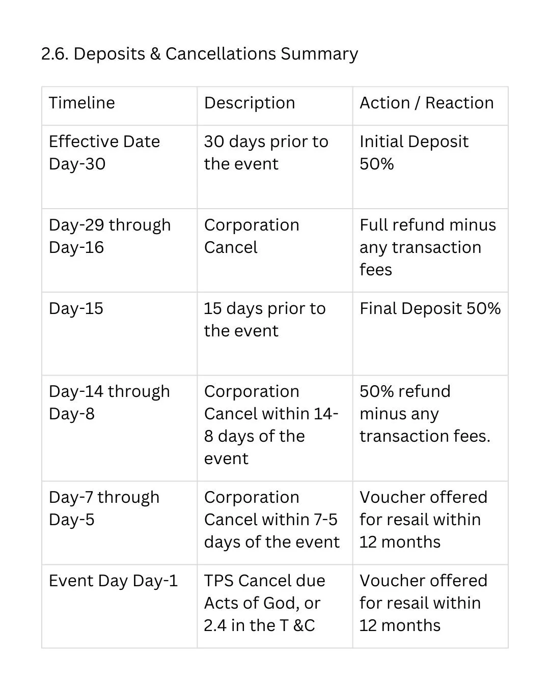 2.2. If the corporation cancels within the period of fourteen (14) days to eight (8) days of the event, the corporation will incur a cancellation fee equal to 50% of the total event cost, minus any transaction fees. This only applies if the final deposit has been paid in full.